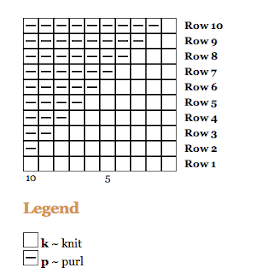 To make the pattern more visual I made a chart of it (this illustration is not part of the original pattern) As you can see it is a triangle pattern made up of knit and purl rows: